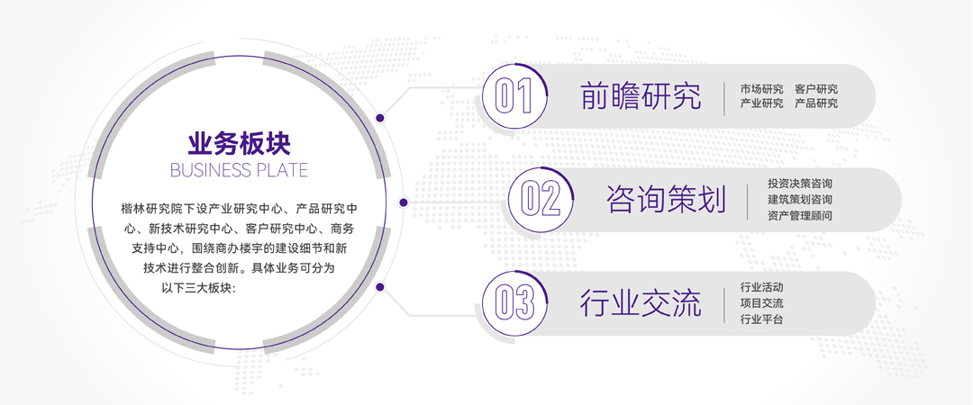楷林研究院與楷林置業(yè)、楷林運營、楷林商服相互支撐,致力于提供前瞻性、落地性、專業(yè)化的樓宇建設(shè)管理服務(wù),使更具活力的商辦樓宇持續(xù)服務(wù)城市。研究院以楷林自身業(yè)務(wù)為基礎(chǔ),在商辦樓宇的開發(fā)建設(shè)與運營管理中尋找委托方、使用者、供應(yīng)商的平衡點,與行業(yè)伙伴共同建立商辦樓宇產(chǎn)業(yè)鏈標(biāo)準(zhǔn)體系。